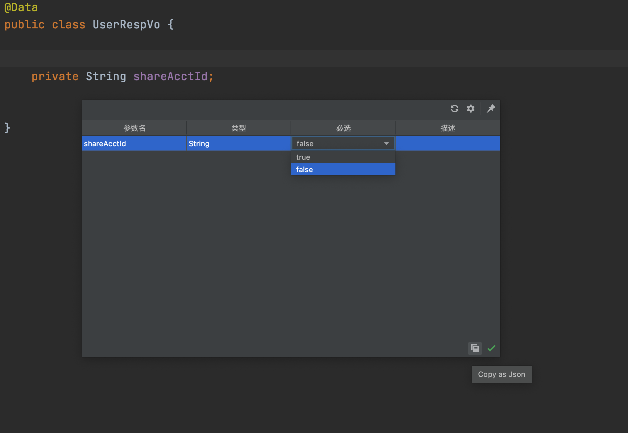 如果上述内容点击 Copy as Json 会将实体转换为 Json 字符串复制到剪贴板。