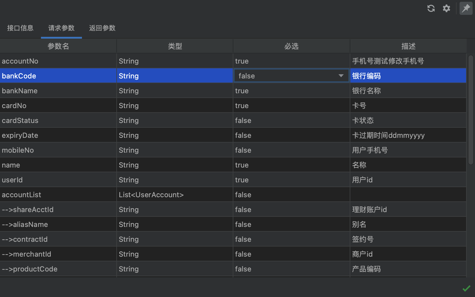 - 请求/返回参数:请求返回参数的是否必填、描述。
