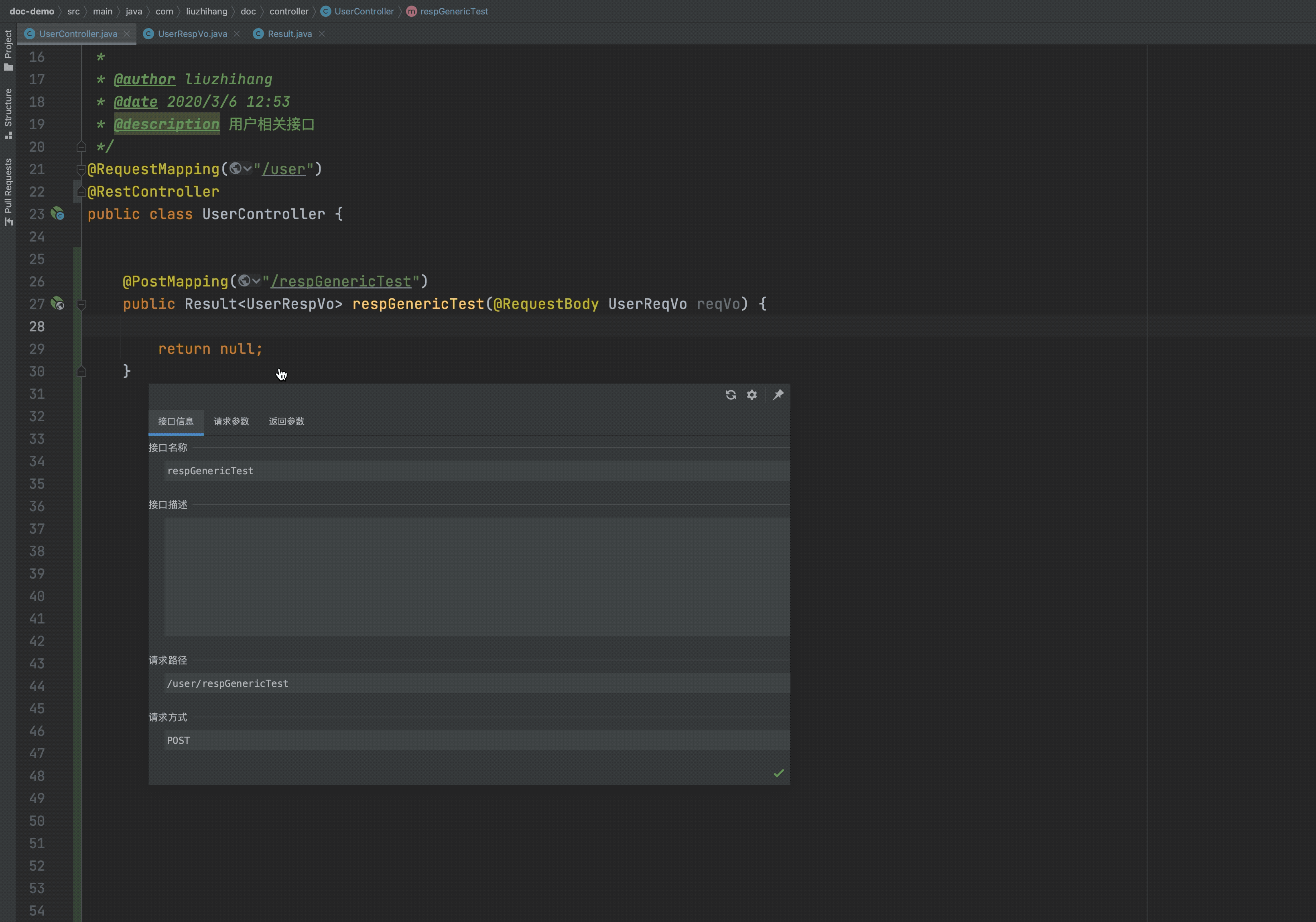 - 接口名称:默认取方法名,当有注释且注释 tag 为 @docName 时,会取 @docName 对应的名称;