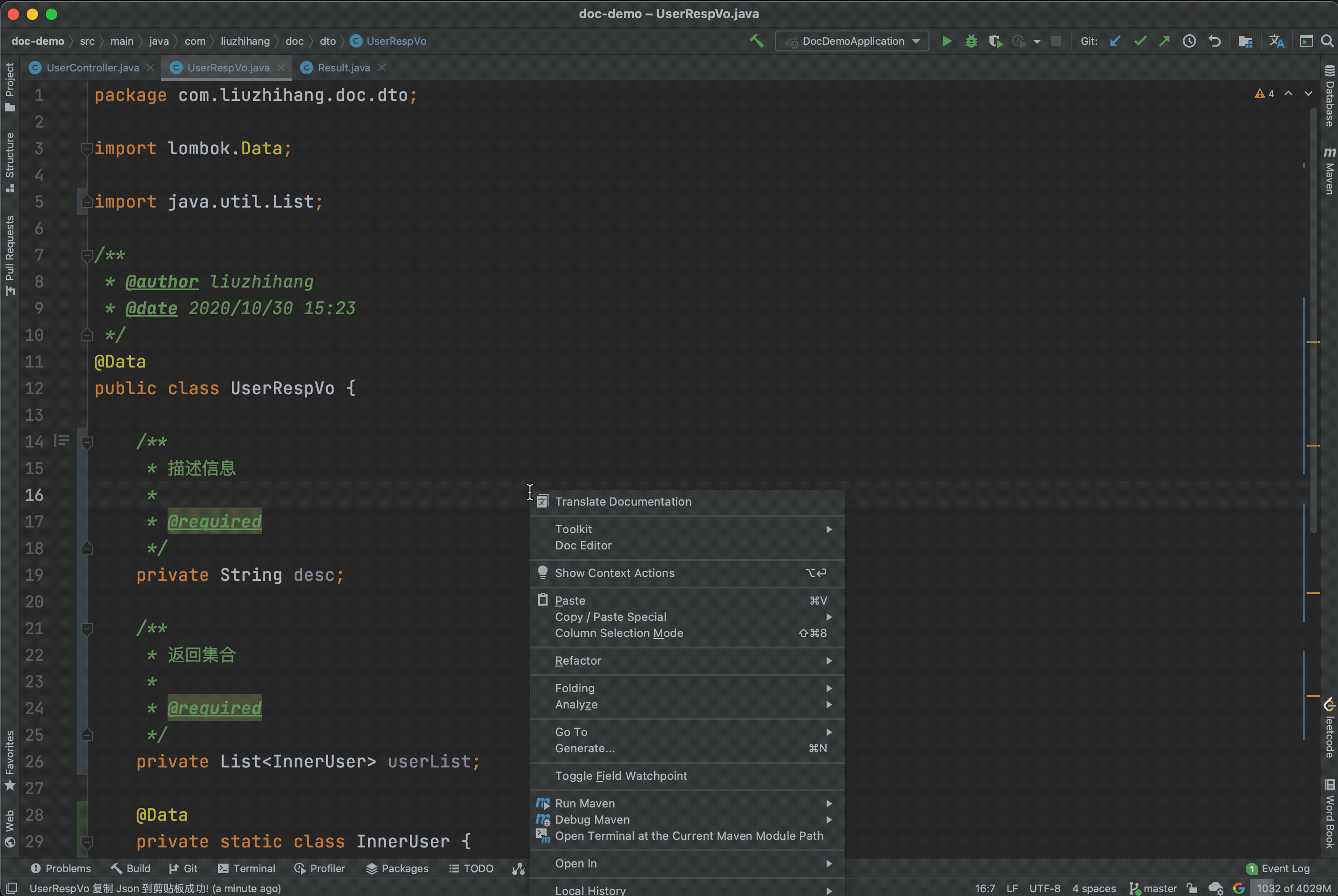 在实体类中右键菜单,其实相当于方法中的请求/返回参数那一部分。