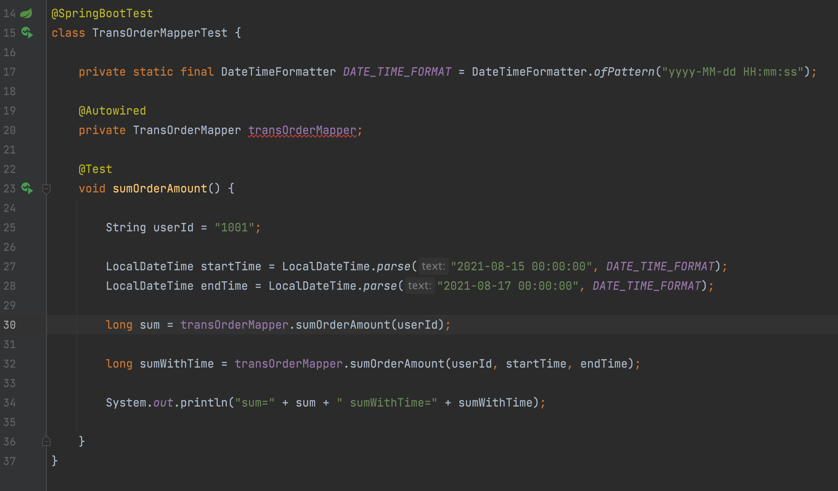 1 | Object result = sqlSession.selectOne("com.liuzhihang.demo.mapper.TransOrderMapper.sumOrderAmount", param); |