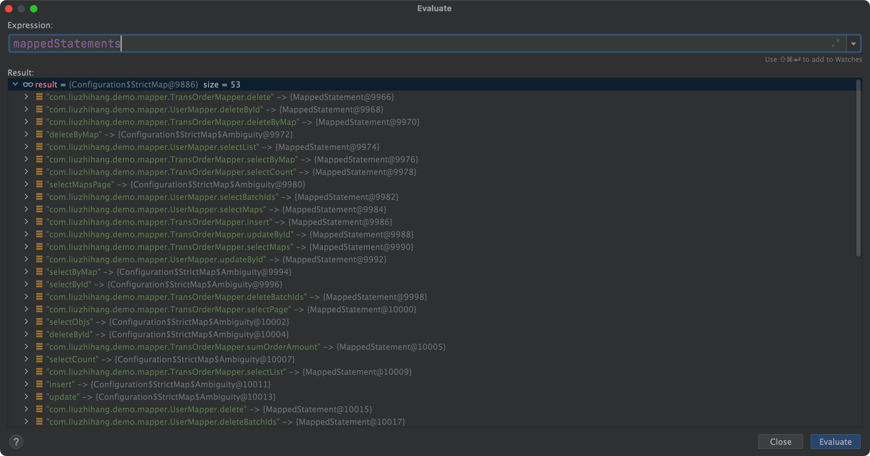 所以这里的意思是根据方法的全路径名称,获取一个 MappedStatement, 而 com.liuzhihang.demo.mapper.TransOrderMapper.sumOrderAmount 在这里面只有一个。
